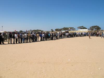 On the Friday morning after my tour of Wasswa’s clinic, the courtyard next to the outlet is packed. Over a hundred people sit on plastic chairs facing forwards while latecomers lean against the back wall. A red tarpaulin sheet shields the crammed attendees from the sun and gives the whole atmosphere an eerie pink hue.